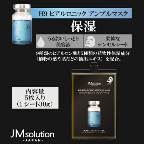 商品名 JM solution H9 ヒアルロニック アンプルマスク アクア 内容量 30g×5枚 箱入り 商品サイズ パッケージサイズ:W120×H174×D24(mm) ご使用方法 1.洗顔後、化粧水で肌を整えた後に袋からマスクを取り出す。